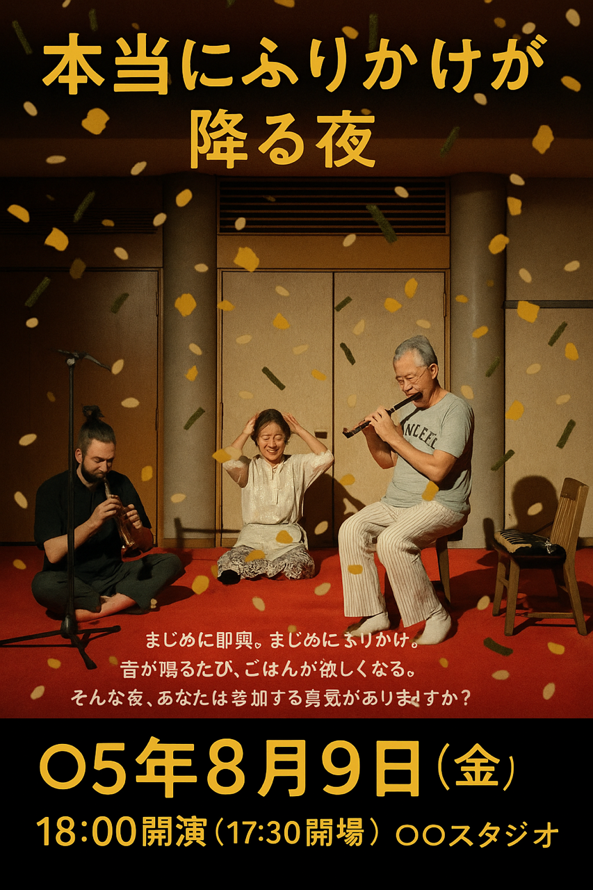 やっとできたイラストを使って、肝心なチラシは他に任せられないと、旦那が仕上げた。文章は旦那が書き、そして「音が鳴るチラシ」というアイディアや、面白いコピーを、ハッスルした番頭さんからいただく。途中でイラレで作り直しかけたが、SNSでリンク付きにするためにはワードが都合がよく、最後は印刷もワードで納品した。● テーマ曲「ふりかけ団地解放中」(番頭さん+SUMO)